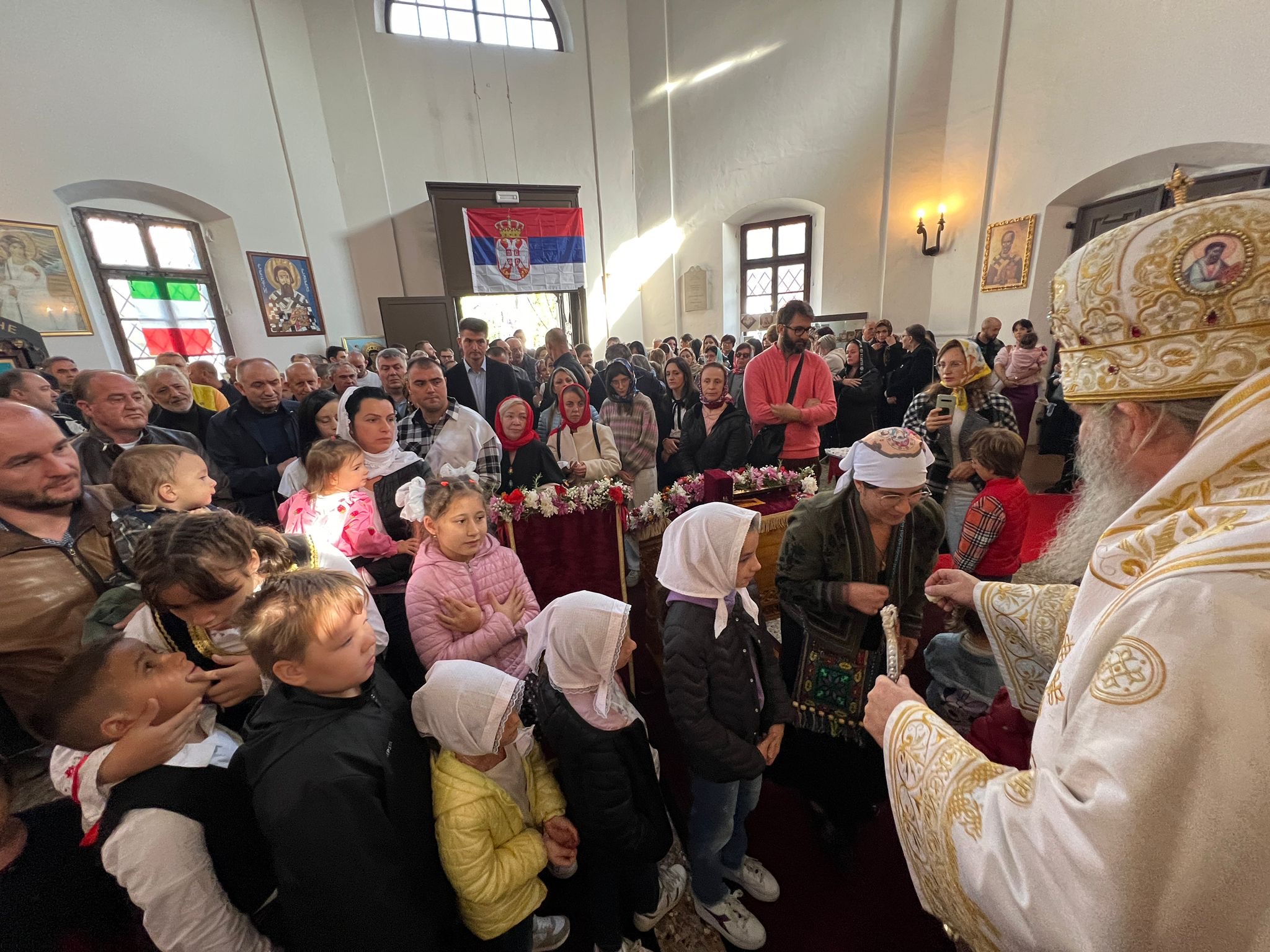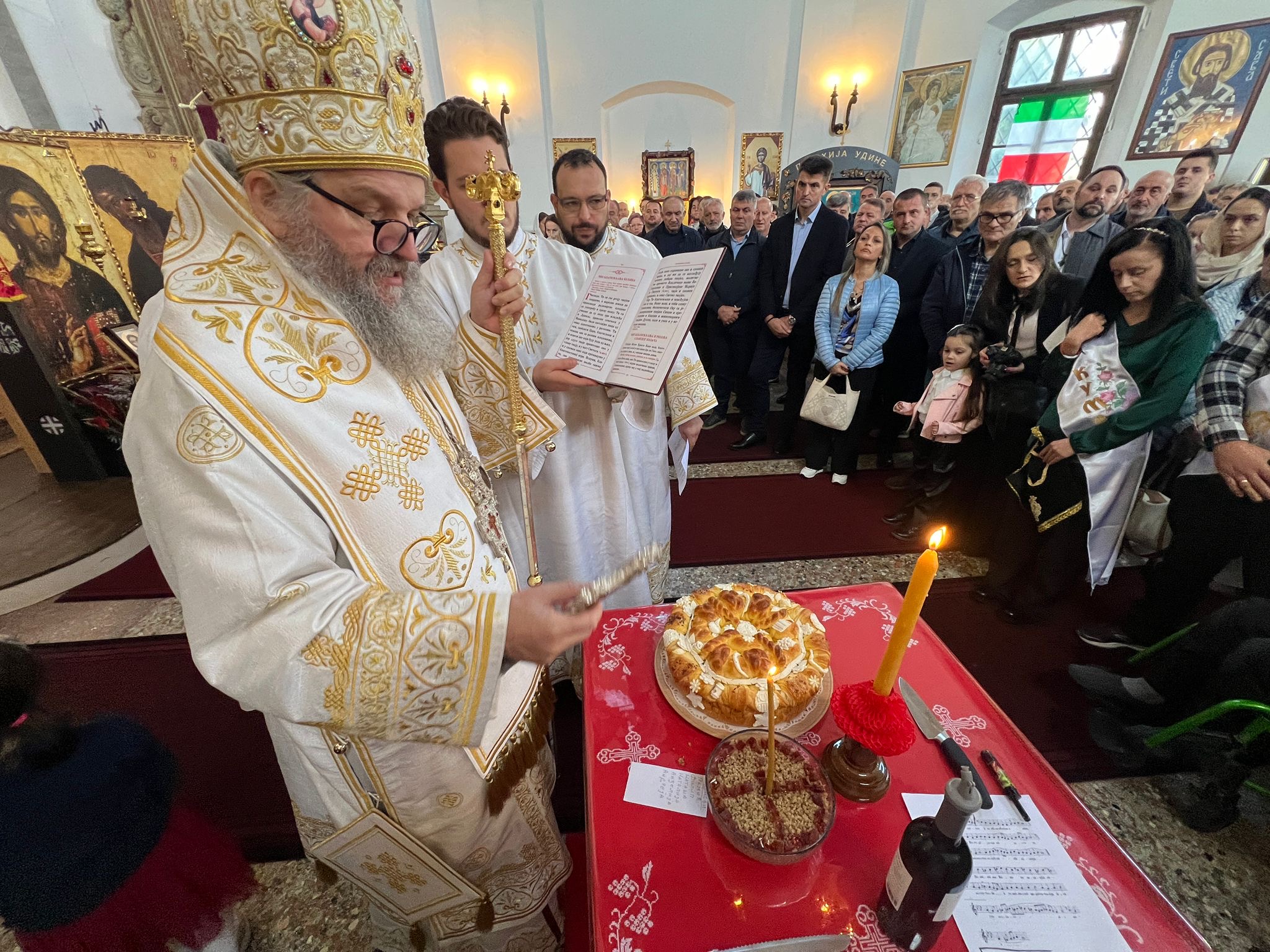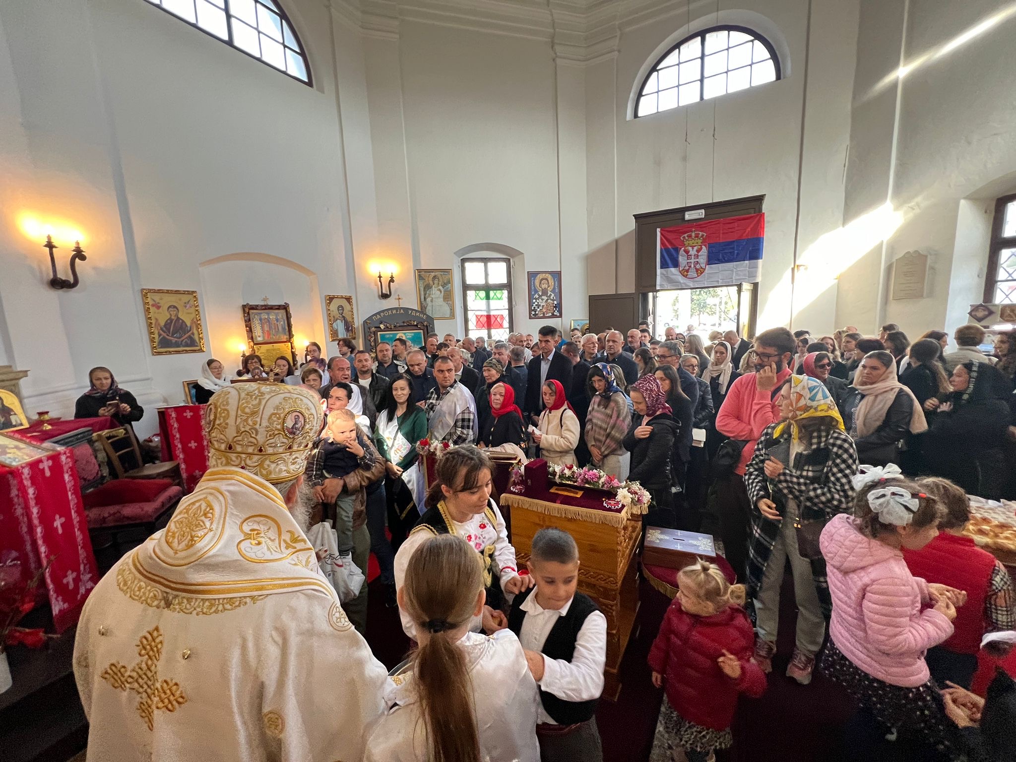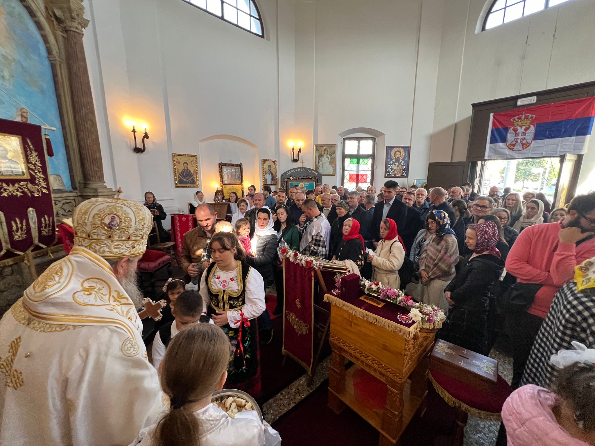 На крају Свете архијерејске Литургије освештан је и преломљен славски колач са овогодишњим кумовима славе, породицом Трејкић, парохијани ове парохије.
