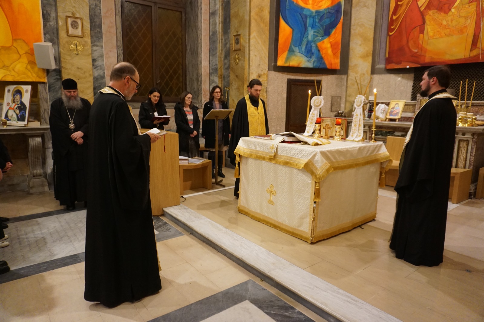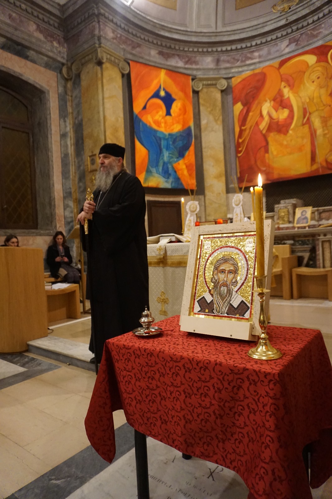 Присутнима се после службе у својој беседи обратио Преосвећени Владика Андреј који је изложио живот и дело Светог Саве, истичући његову посебну улогу у зидању манастира Хиландара на Светој Гори. После службе, Епископ је најпре остао на малом пријему у храмовној сали, а затим је одржао братски састанак са украјинским свештеницима и од срца заблагодарио надлежном пароху Проти Роману на свему што од избијања рата чини за интеграцију верника из Украјине у литургијски живот мисионарске парохије Светог Саве у Риму. У наставку, Владика Андреј је на позив католичке цркве посетио католички духовно-културни центар Алети (Centro Aletti, Via Paolina 25), познати атеље за израду мозаика, чија управа је уступила богослужбено место и помоћне просторије за литургијски живота верника Српске Цркве у Риму.