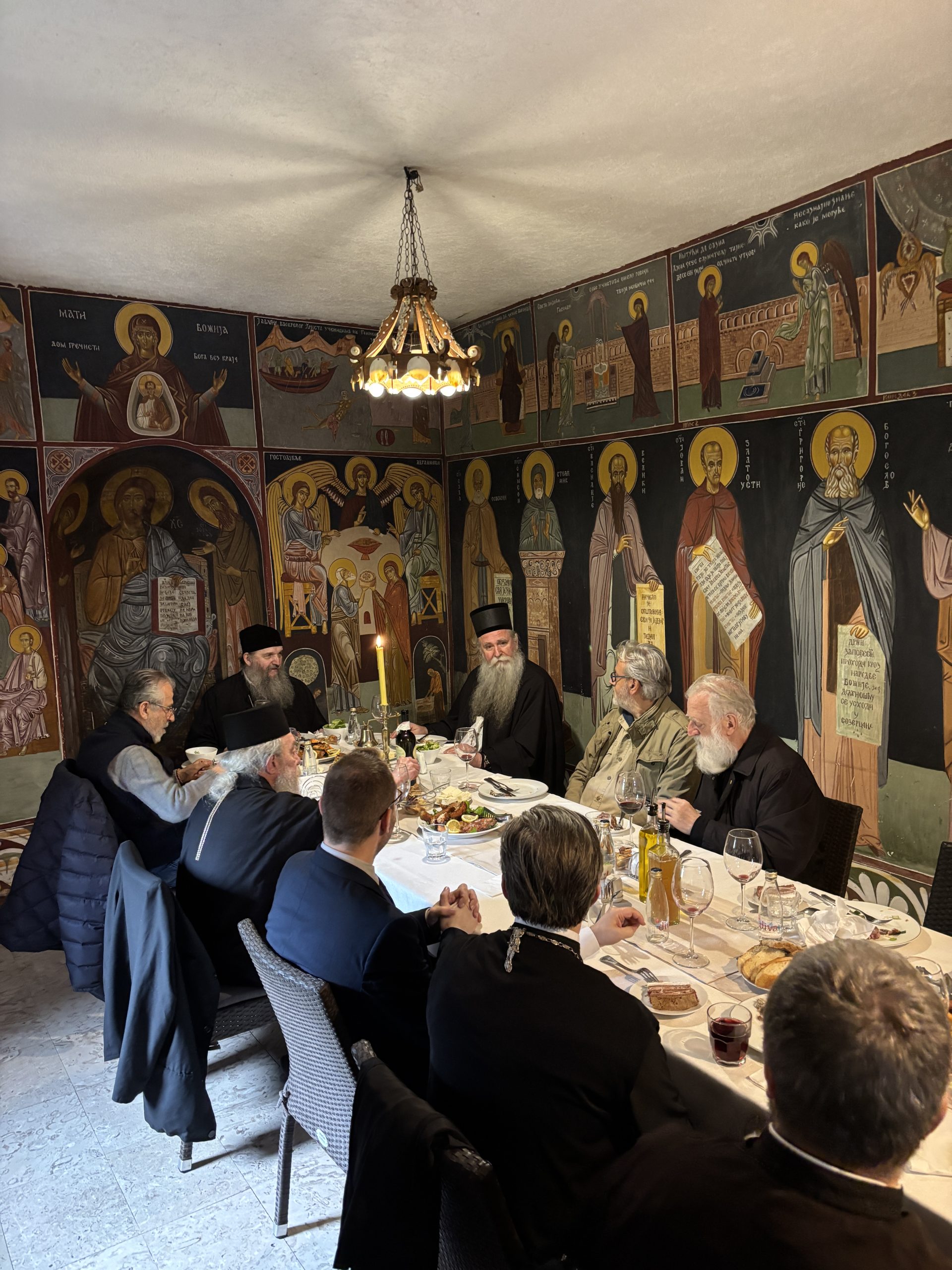Добротом манастира Острог, за све госте је приређен свечани ручак у манастирској трпезарији, где су у братској атмосфери размењиване речи захвалности и духовне поуке. Током обеда, Митрополит Јоаникије, Епископ Андреј и остали присутни подсетили су се заједничких сусрета и успомена на блаженопочивше великодостојнике Српске Православне Цркве, међу којима су Патријарх српски Павле, Митрополит црногорско-приморски Данило и други значајни архијереји. Посебну пажњу привукло је казивање Епископа Андреја о животу и страдању Патријарха српског Гаврила, са посебним освртом на његов боравак у манастиру Острог. Он је истакао улогу коју је ова светиња имала у духовном животу Патријарха Гаврила, његово сведочење вере у тешким временима, као и значај његове пастирске службе за очување православног идентитета у српском народу. Ово сабрање било је прилика да се кроз заједничко сећање и размену мисли још једном потврди жива веза са духовним наслеђем великих личности које су својим животом и делом обогатиле Цркву Христову.