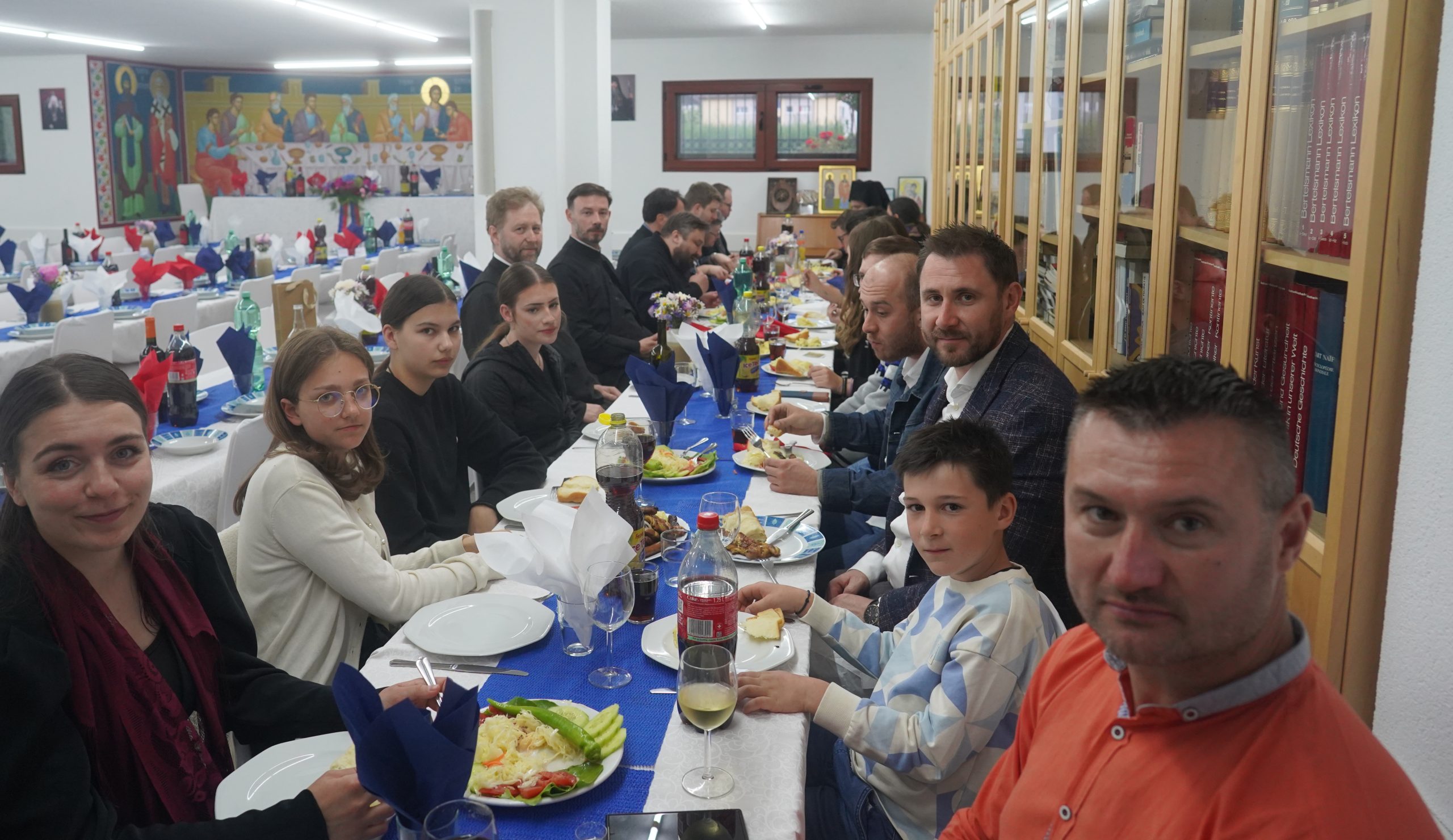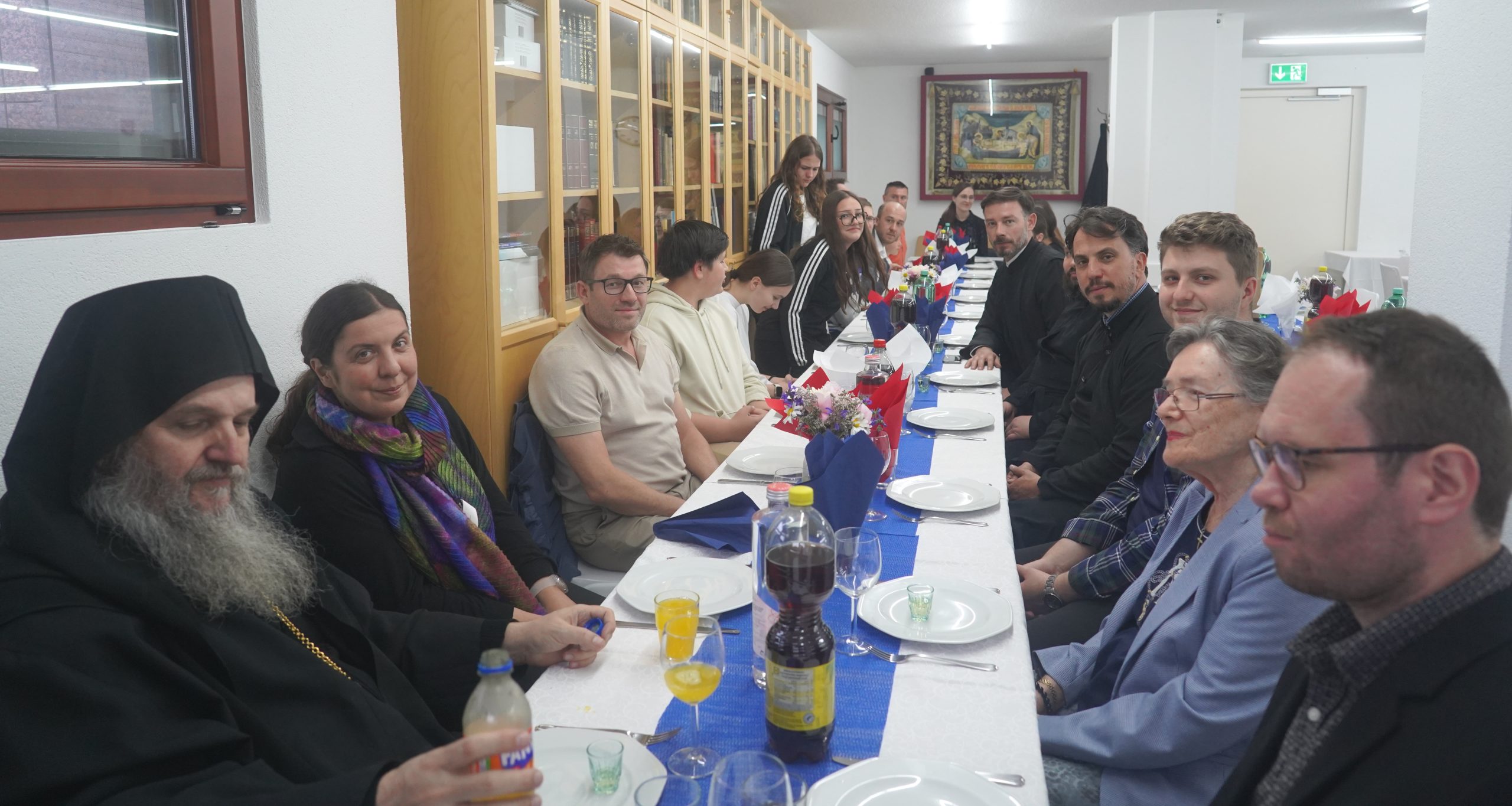Свечано расположење настављено је у парохијској сали, где је за Епископа, свештенство и госте уприличена вечера у братској атмосфери. Уз песму, разговор и благодарност, заокружено је ово молитвено и саборно вече уочи велике славе.