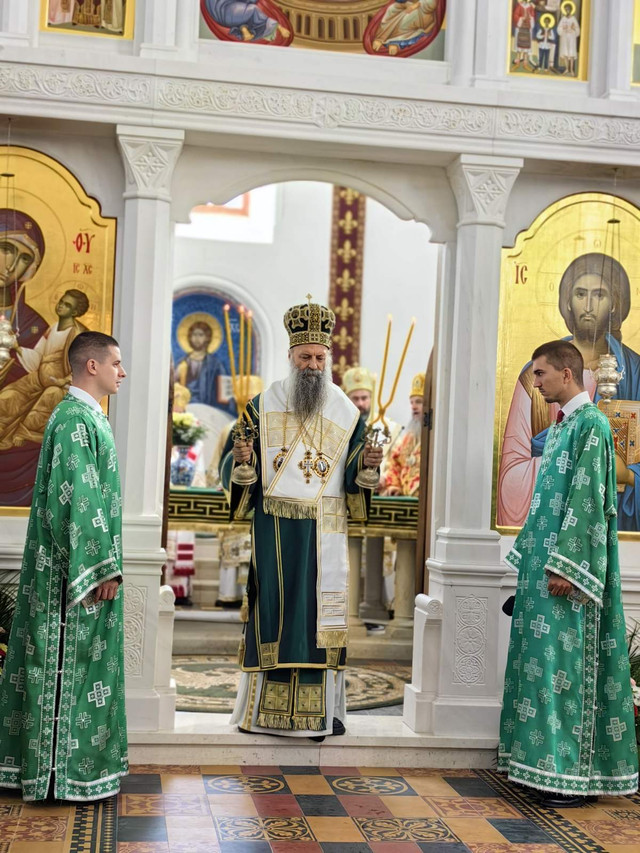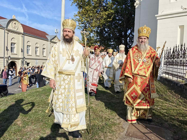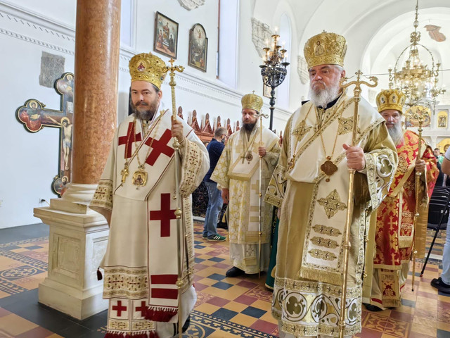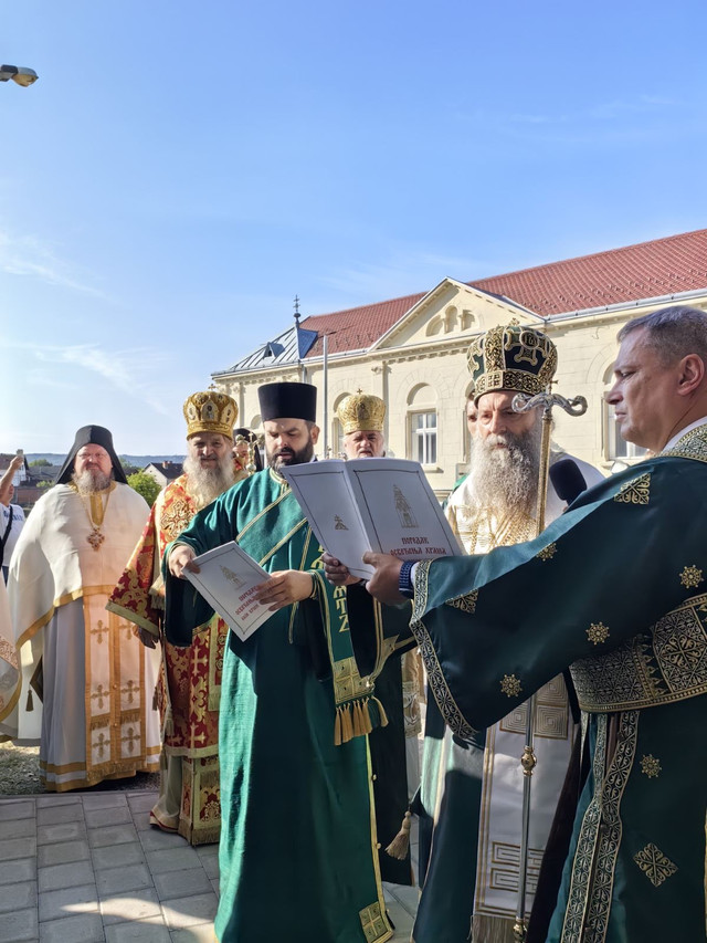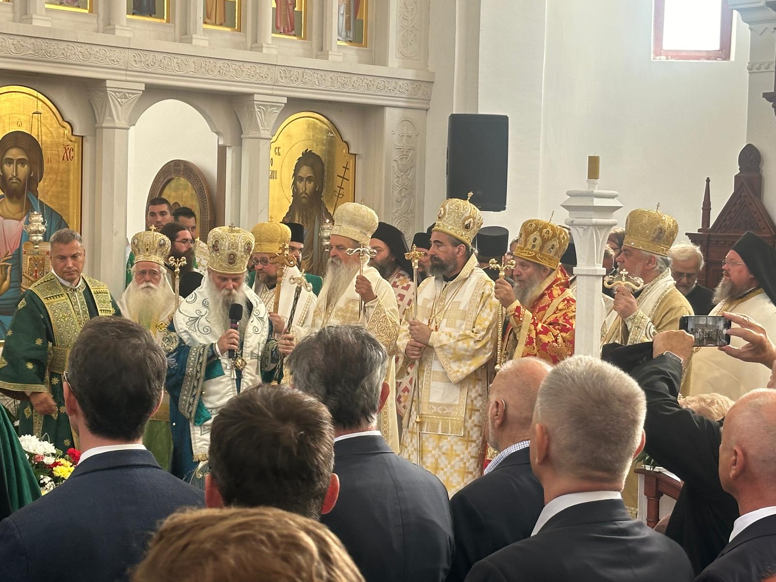 Светом архијерејском Литургијом и чином освећења началствовао је Његова Светост Патријарх српски г. Порфирије, уз саслужење бројних архијереја наше и других помесних Цркава: Архиепископа антидонског Нектарија из Јерусалимске Патријаршије, Митрополита димитријадског и алмирског Игнатија из Атинске Архиепископије, Архиепископа михаловско-кошичког Георгија из Православне Цркве Чешких земаља и Словачке, митрополита: црногорско-приморског Јоаникија, диселдорфског и немачког Григорија, рашко-призренског Теодосија, захумско-херцеговачког Димитрија и будимљанско-никшићког Методија, као и епископа: источноамеричког Иринеја, пакрачко-славонског Јована, швајцарско Андреја, бихаћко-петровачког Сергија, буенос-ајреског и јужноцентралноамеричког Кирила и липљанског Доситеја.