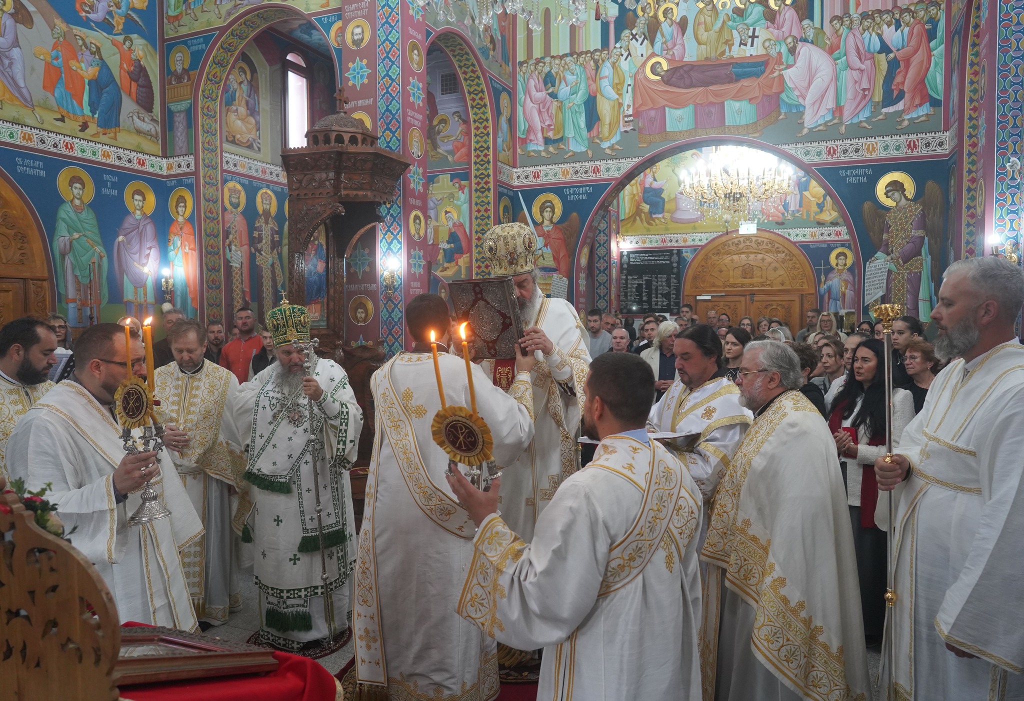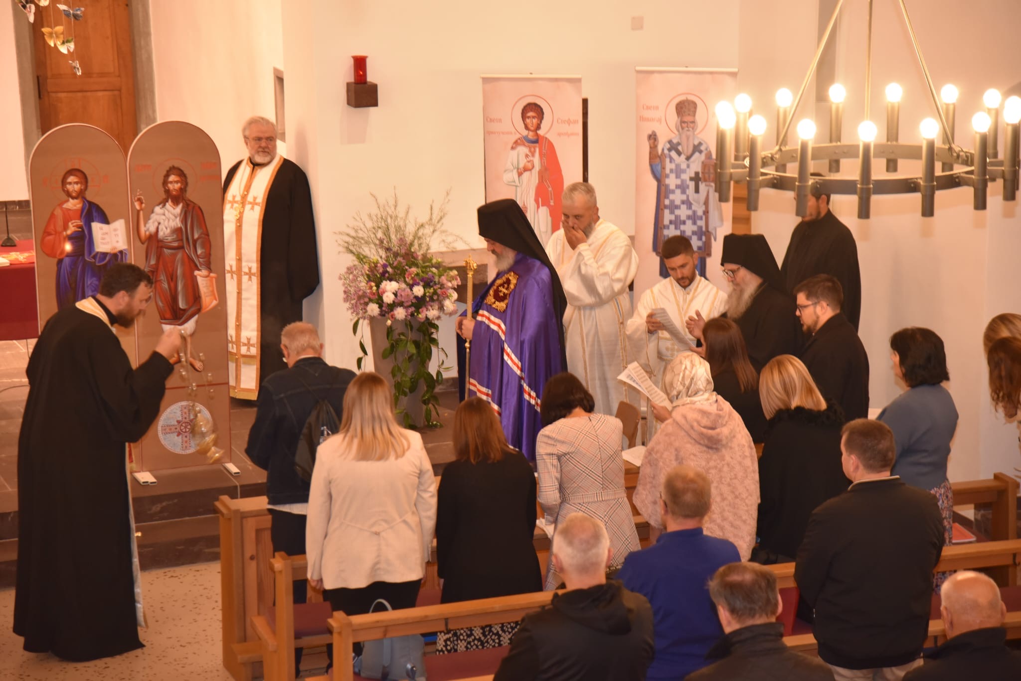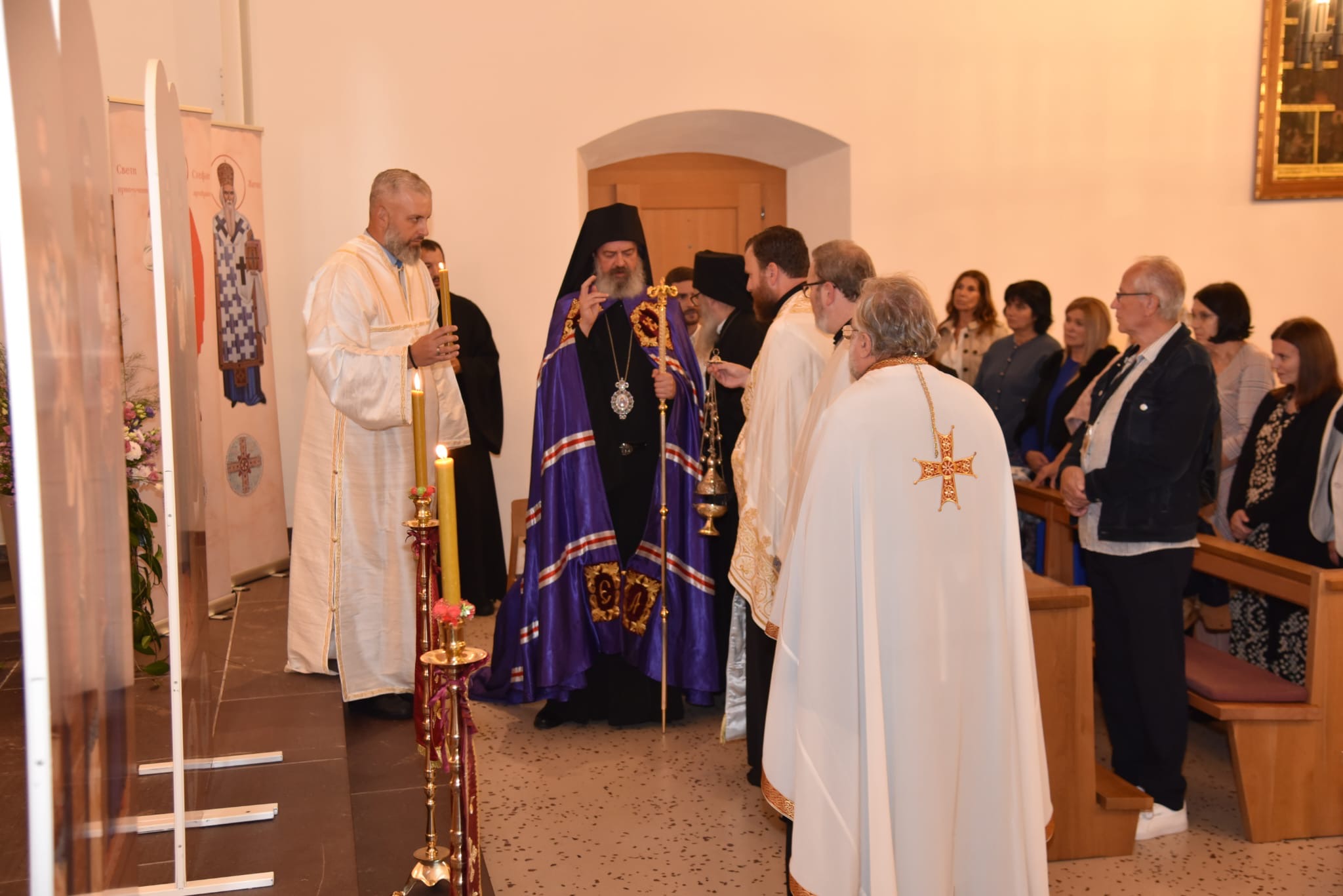 Том приликом служено је празнично вечерње богослужење у присуству бројних свештеника, верног народа и гостију. На богослужењу су саслуживали протојереј Дејан Арсић, секретар ЕУО Епархије нишке, протојереј Небојша Оровић, парох храма Светих цара Константина и Јелене у Нишу, протојереј Ђорђе Лукић, парох храма Свете Тројице у Цириху, јереј Милован Дерета, парох храма Светог архангела Гаврила у Батајници, јереј Ивица Ђулић, парох у Милану, јереј Ненад Бркић парох у Мелсу и ђакон др Никола Лукић, доцент на Катедри за литургијско богословље Православног богословског факултета у Београду.